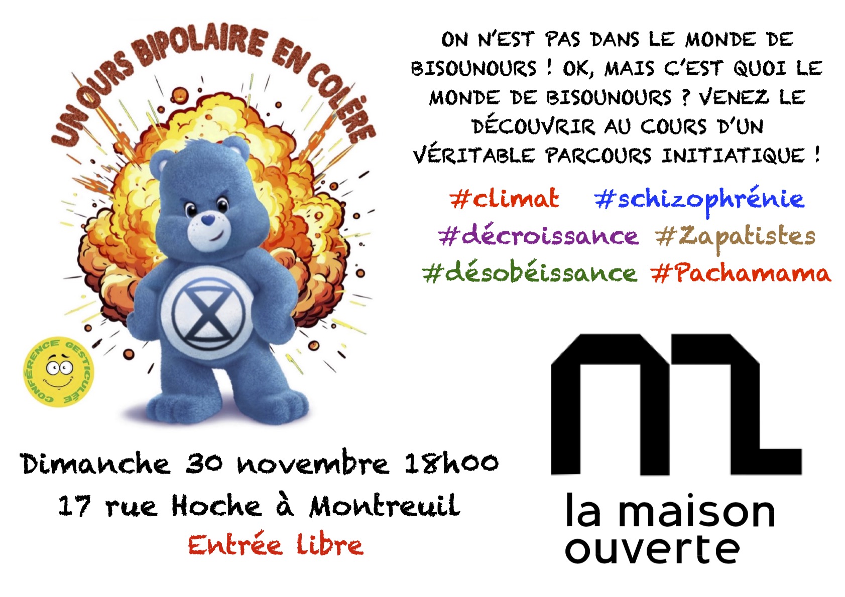 Prenez un utopiste, mettez-lui le nez dans le dérèglement climatique, puis trempez-le dans Extinction Rebellion, dans la décroissance, dans les gilets jaunes et dans les Zapatistes. Vous obtenez un ours bipolaire en colère capable de vous refaire le monde en une heure et des poussières. Éteignez la télé et laissez Bisounours vous réveiller pour vous faire rêver d’un nouveau monde. C’est le one-man-show pour la vie contre l’argent.