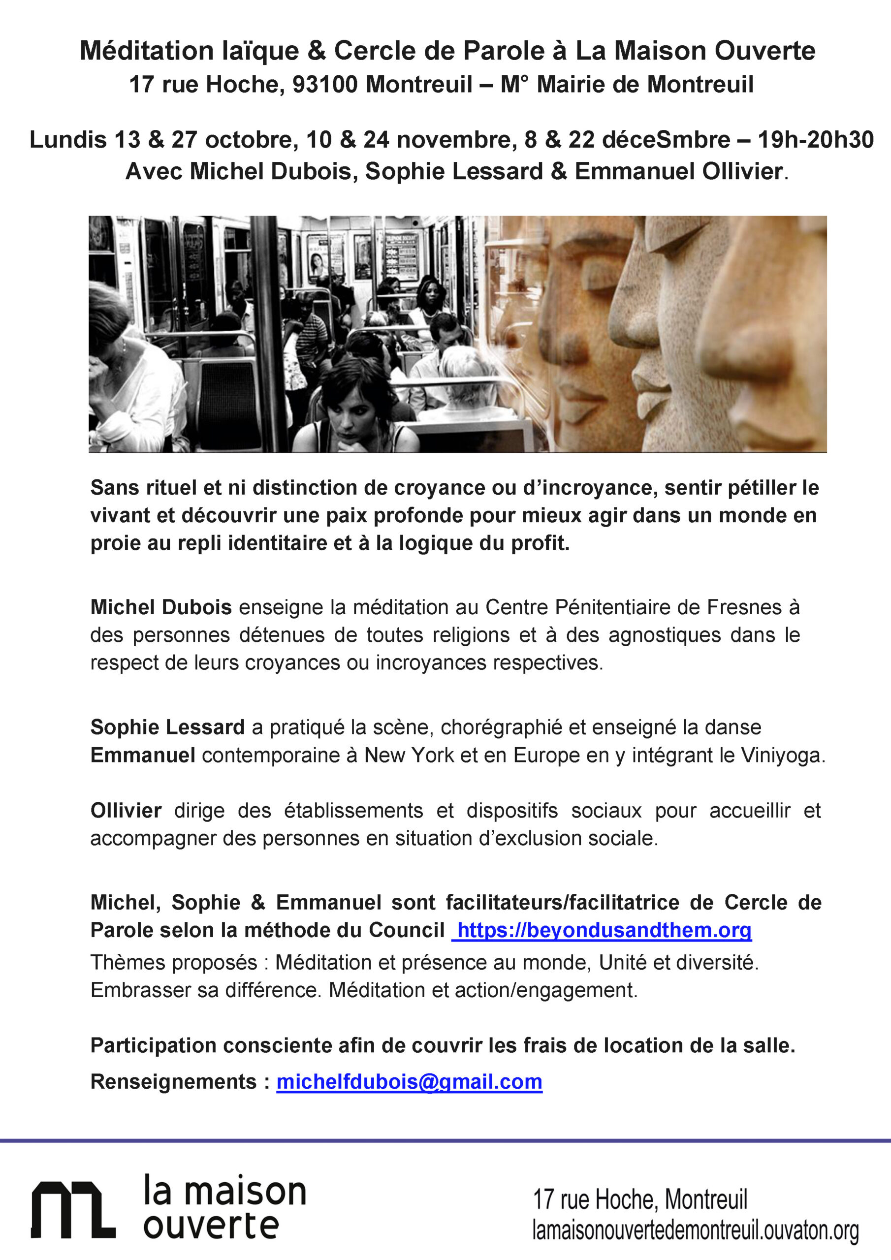 Sans rituel et sans distinction de croyance ou d’incroyance – découvrir une paix profonde pour mieux agir dans un monde en proie au repli identitaire et à la logique du profit. Michel Dubois enseigne la méditation au Centre Pénitentiaire de Fresnes à des personnes détenues de toutes religions et à des agnostiques dans le respect de leurs croyances ou incroyances respectives.