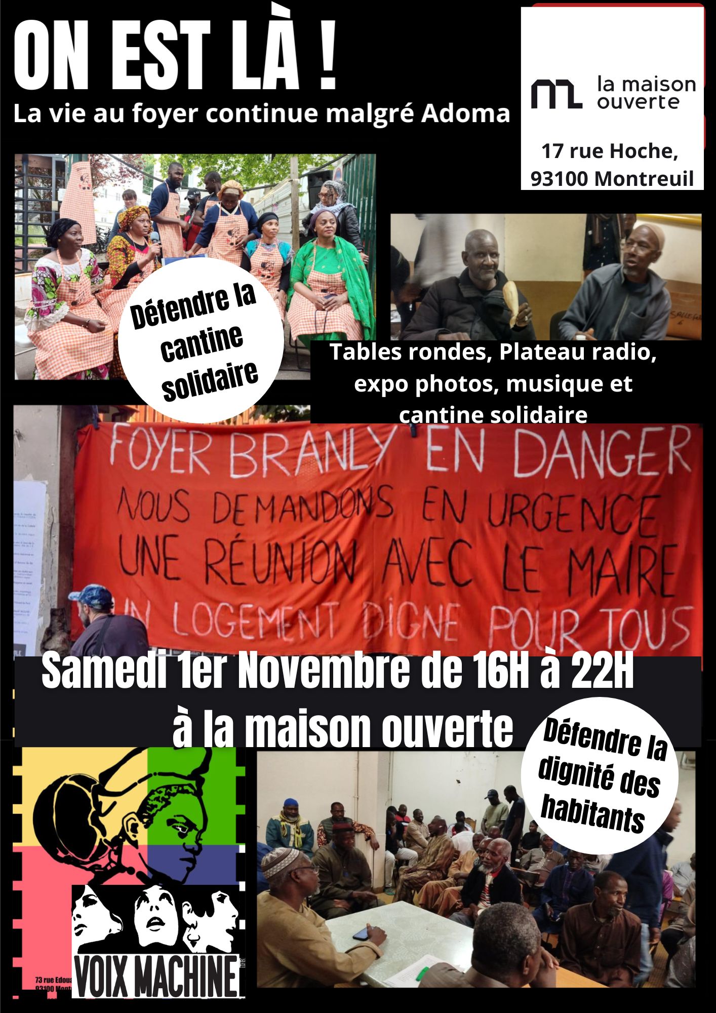 Le 1er novembre à la maison ouverte, puis le week end du 15-16 novembre au foyer Branly, nous organisons deux événements pour nous rassembler et nous vous attendons nombreux.ses pour soutenir notre lutte, qui en rejoint bien d’autres ! Lutter pour le droit au logement digne, lutter contre le racisme institutionnel qui conduit à délaisser ou à négliger les besoins des habitants quand il s’agit de travailleurs immigrés – et encore plus quand il s’agit de personnes non régularisées en France, lutter pour conserver et renforcer des moyens d’organisation collective et populaire, sur le plan alimentaire et au delà.Nous communiquerons le programme final pour ces deux événements prochainement, mais notez déjà la date ! A très vite