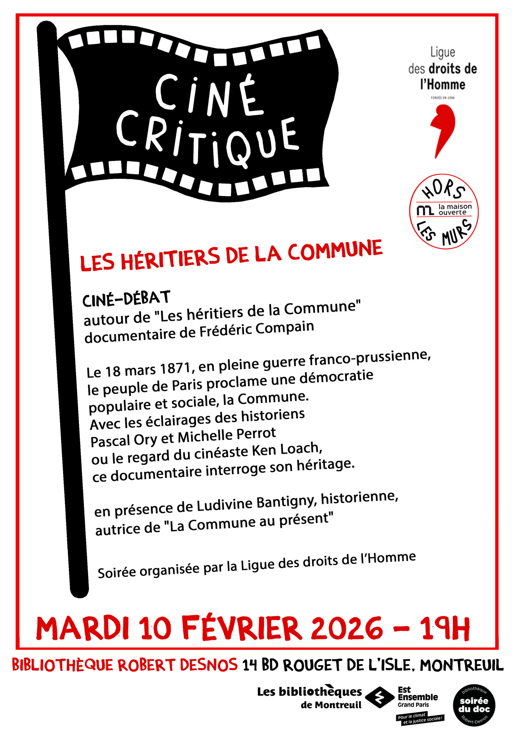 En 2026, durant les travaux de la Maison ouverte, les ciné critiques organisés par la Ligue des Droits de l’Homme ont lieu à la Bibliothèque Robert Desnos, 14 bd Rouget de l’Isle à Montreuil.